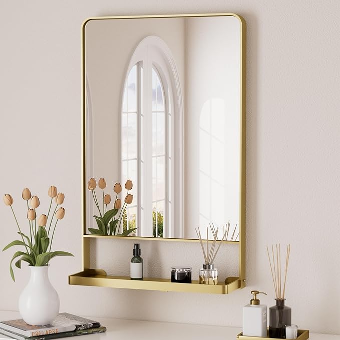 18 x 28 Inch Gold Bathroom Mirror with Shelf, Modern Metal Gold Wall Mirror with Shelf