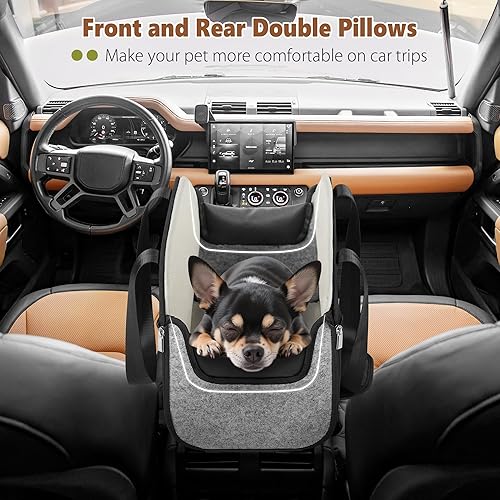 18 lbs Large Dog Car Seat Pet Center Console (Width 9in) Seat Puppy Cat Travel Portable Booster Anti-Slip Dog Car Bed Carseat Machine Washable Gray Extra Large Space for Your Pet Baby - We have designed a spacious pet dog car seat. The internal dimensions have been widened to 16.93*8.54*9.85inches while maintaining the overall product size of 17.32*9.65*9.85 inches. This allows pets up to 18lbs to comfortably fit inside the seat. Bringing Sense of Security - Most pets are not accustomed to car rides, which can cause them to feel nervous, anxious, and even experience motion sickness. The primary purpose of a center console dog car seat is to allow you to be closer to your dog, providing a sense of security and fostering a stronger bond and intimacy with your pet. Additionally, it helps keep your pets calm and quiet during car journeys. Easy to Assemble, Stable, and Firm - Compared to the single fixed rope offered by other products, our dog booster seat features two fixed ropes, ensuring enhanced stability and safety. Suitable for pickup trucks, full-size SUVs, luxury vehicles (Width >9in). It is both easy to install and disassemble. Easy-to-clean design: The outer surface is made of a dirt-resistant material. In daily use, there is no need for cleaning. The detachable inner lining is soft and skin-friendly, and it can be removed separately for machine washing. Multifunctional Car Travel Carrier - In addition to its primary function, our dog car seat can also be disassembled and transformed into a travel pet carrier. This feature allows you to conveniently transport your pet to various places such as the hospital, supermarket, or park. By simply zipping it up and utilizing the included comfortable shoulder strap, you can effortlessly carry your pet, ensuring a hassle-free and convenient travel experience.