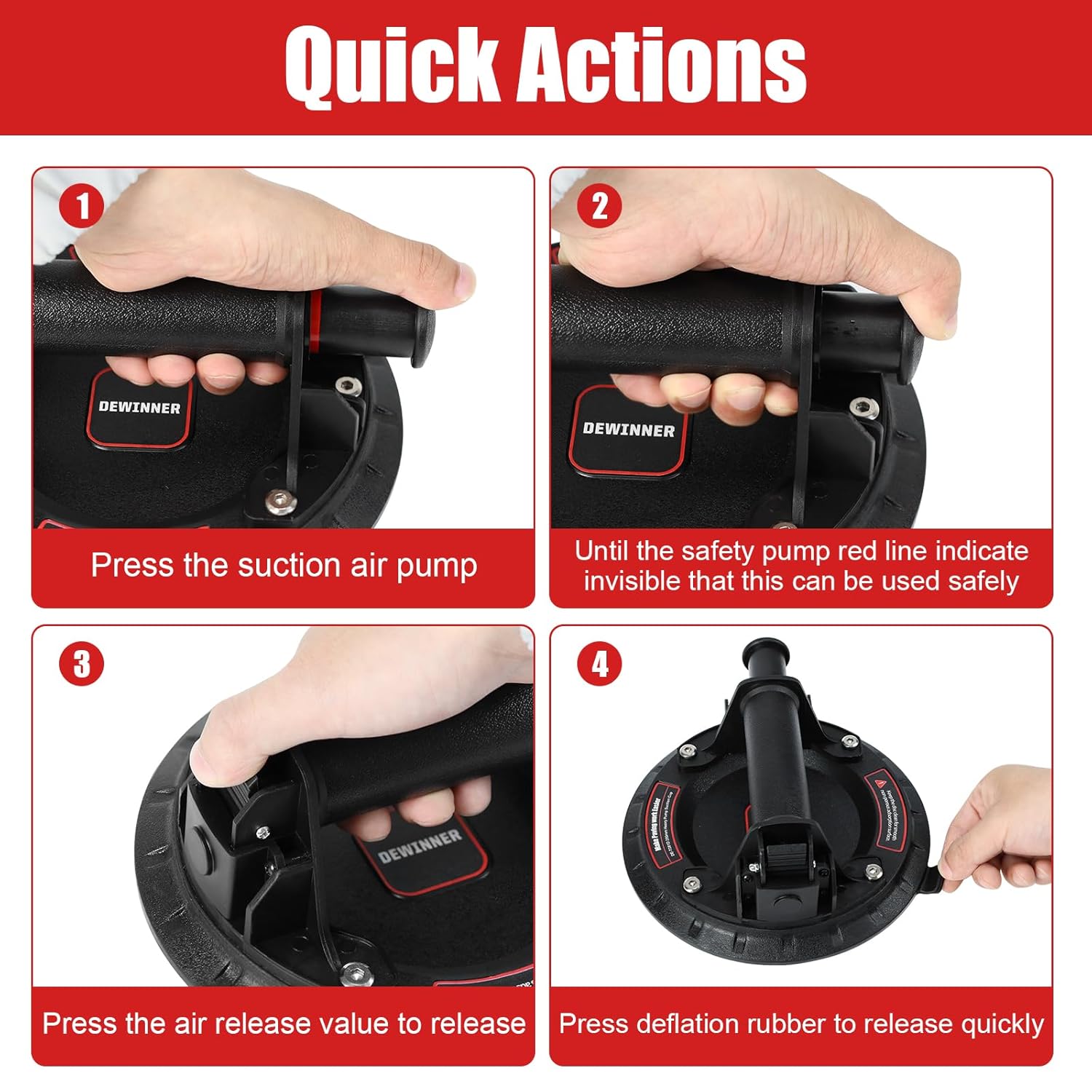 Easy to Use: Place the vacuum cup on a flat surface, press the pump until the red line disappears; release using the bleeder valve or release tab Safety Tip: Use two suction cups for items over 110 kg; avoid rough, porous, curved surfaces, or those with water or oil for best results
