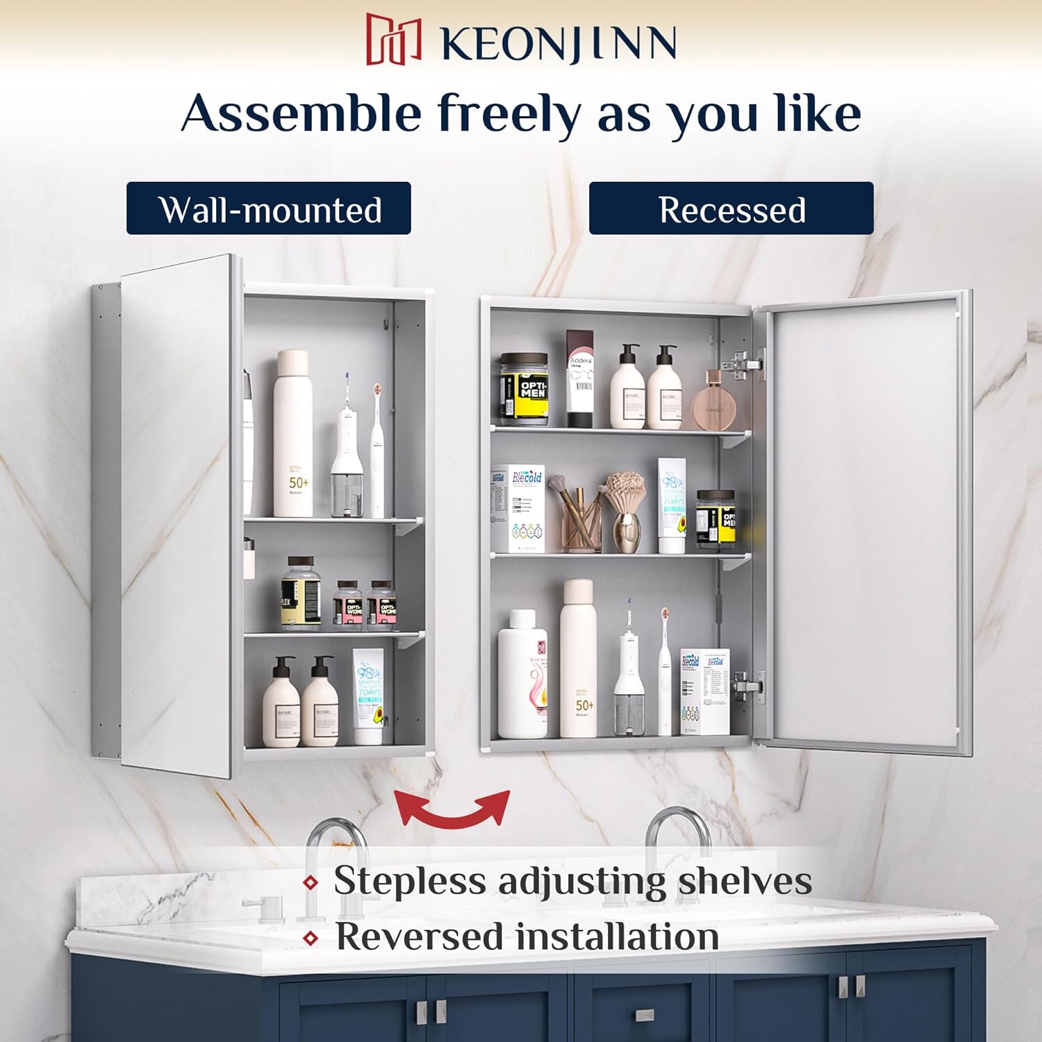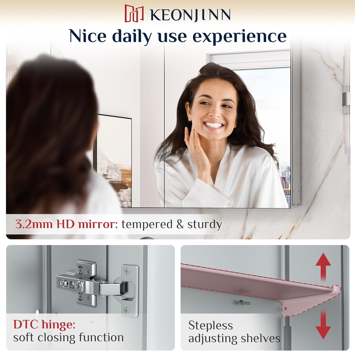 Due to the aluminium structure and aluminium-plastic backboard, this sturdy medicine cabinet would be much lighter comparing to iron or wood mirror cabinet. The abilty of resistant to moisture and rust making it a wonderful long lasting choice in your bathroom, living room, hallway, etc. 【Assembly Required But Easy to Go】NOTICE: Although this bathroom medicine cabinet mirror requires assembly, there are no complicated parts or steps, which makes it easily to get started with the installation alone. In addition, we offer live installation videos as well as detailed manual in the package to guide you through the process and ensure you have a smooth installation experience. 【Tailored Storage & Flexible Installation】This mirrored cabinet for bathroom can be customized to meet your needs. The freely adjustable and removable shelves can fit a variety of items of different heights for a tidy bathroom life. Wall-mounted or recessed are both supported by our cabinet. Reversed installation enables the cabinet door open to left or right. No matter what the layout of your bathroom space is, there is always a suitable place for it. 【HD Reflection & Soft Closing】The tempered glass of this mirrored medicine cabinet not only brings HD imaging, but is also not easy to be broken, making it safer to use. Equipped with DTC hinges, it allows the door to open at a greater angle and bring a soft closing effect at the same time. Good-looking and detail-oriented practical mirror cabinet can bring you a continuous good mood.