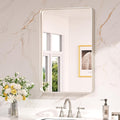 Embrace the modern sophistication of Keonjinn Gold Rounded Metal Frame Mirror. With a clean rounded rectangular shape and subtle details such as a floating effect, the wall mounted bathroom mirror is meticulously designed to add a delicate touch to any decor in your bathroom, bedroom, living room, fireplace or entryway. 【Sturdy Frame with Color Options】Crafted with enduring aluminum alloy, this vanity mirror's sturdy frame remains moisture-proof, rust-resistant, and non-deforming over time, providing a reliable addition to your bathroom. Choose from three elegant color options: Matte Black, featuring a fine granular finish; Brushed Gold and Brushed Nickel, both with a sleek, brushed texture. Each color brings its unique charm, to match any décor. 【Strong Mirror with Shatter-proof Assurance】Experience crystal-clear and distortion-free reflections with our bathroom mirror's 4mm thick tempered glass. Reinforced with a shatter-proof film, it ensures both safety and durability, allowing you to focus on your daily grooming routine without worry.