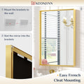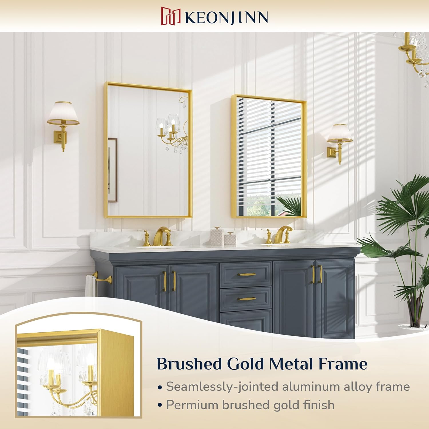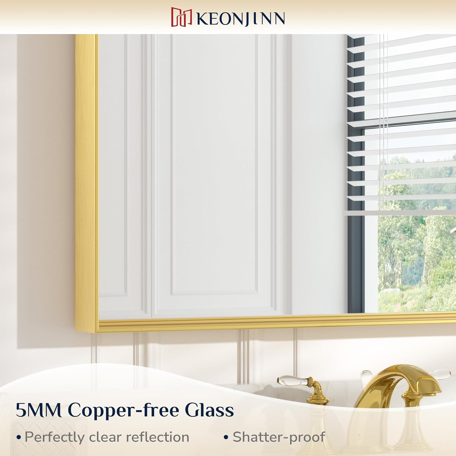 The rectangular wall mirror has the most chic dark brushed gold finish, coming with a 1.57" depth Aluminum alloy frame. Square corner mirror features the minimalist style and able to add texture to your space. Give an instant premium upgrade to any room with Keonjinn gold metal framed mirror. 【Secure & Easy Installation】The sturdy wall mirror designed with 4 built-in slots on the back for hanging horizontally or vertically. Super easy to install with French cleat brackets. Hardware Included. We have designed a sturdy 4-layer packaging for mirrors, so you don't have to worry about receiving a broken mirror. 【Exceptional Quality】Our dark gold rectangle bathroom mirror is made of HD 5mm glass, bright and anti-distortion, which provides excellent reflection. Aluminum alloy frame and PVC shatterproof film would strengthen the floating glass for safety, waterproof and anti-corrosion in wet bathroom environments.