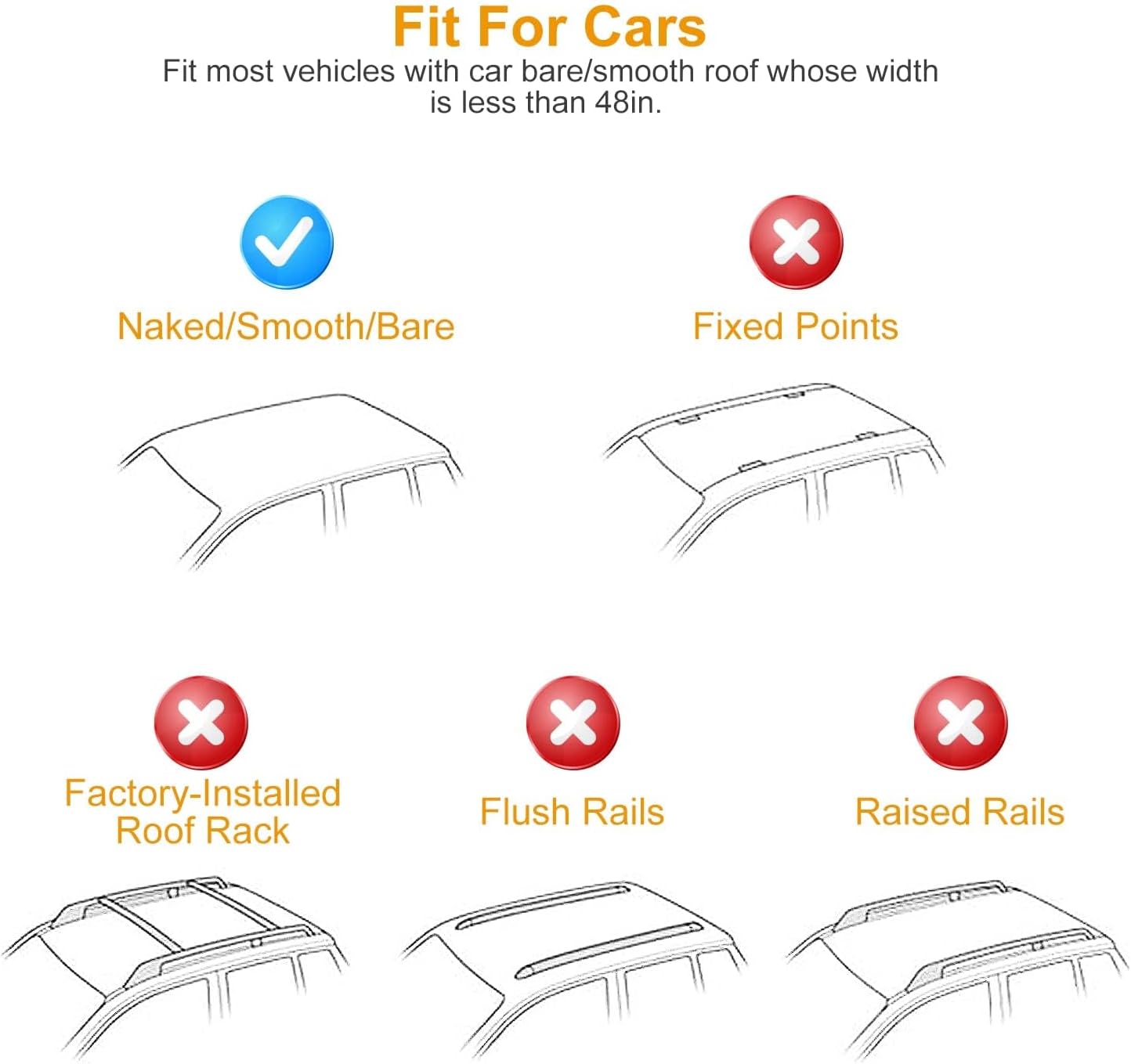 - Fit For Most Bare Roof: Universal fit most vehicles with car bare/smooth roof whose width is less than 51.18in. Don't fit any vehicles with raised rails, flush rails, fixed points and factory-installed roof rack. Please check your car before purchasing.