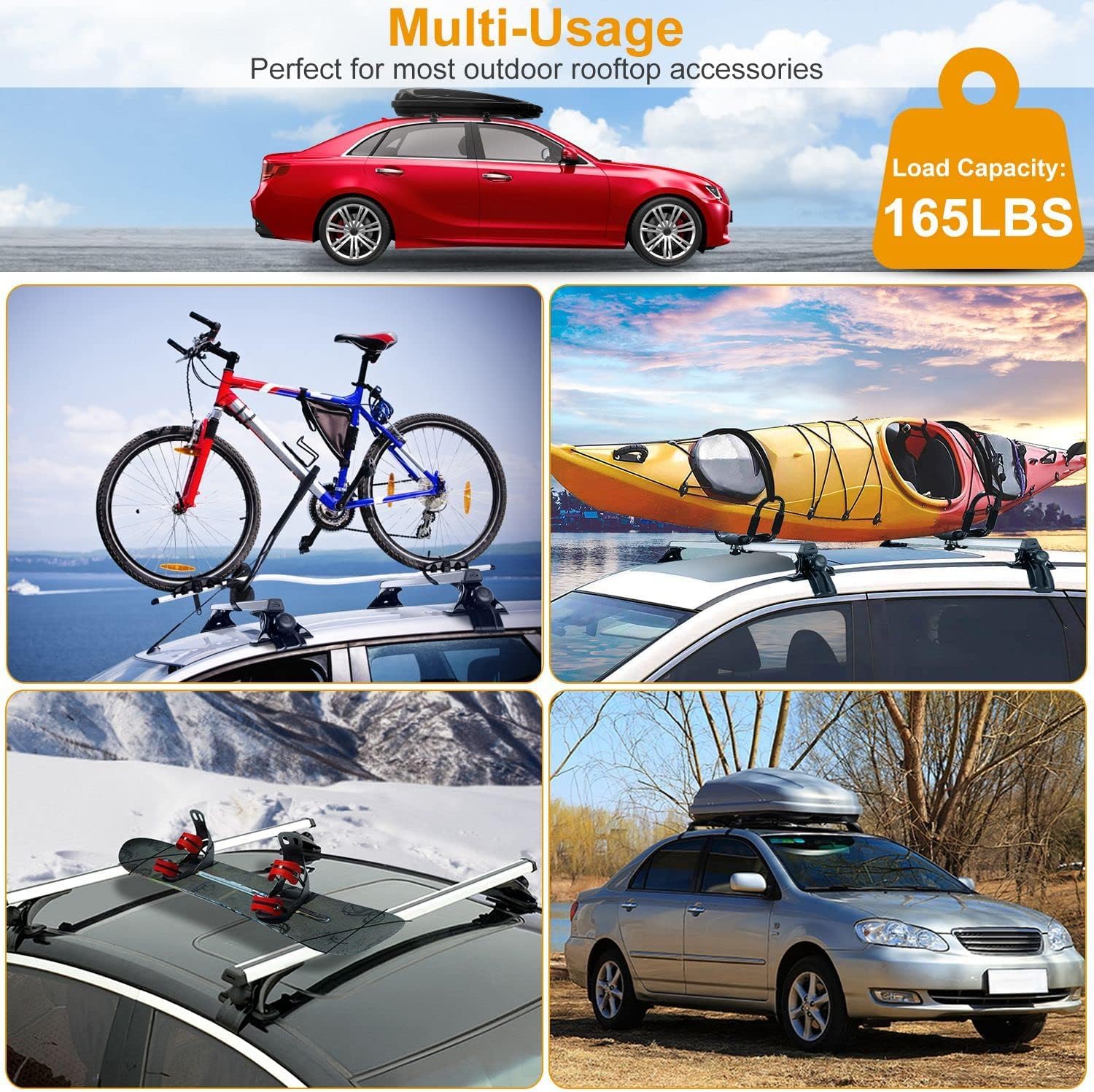- 165LBS High Load Capacity: Made of premium aluminum, our car roof rack is light weight and durable, having a load capacity up to 165lbs, suitable for most rooftop accessories you want to carry.