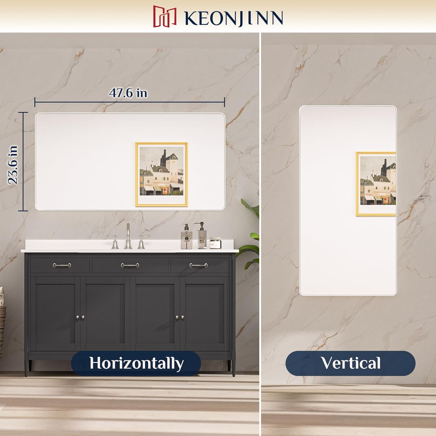 Embrace the modern sophistication of Keonjinn Gold Rounded Metal Frame Mirror. With a clean rounded rectangular shape and subtle details such as a floating effect, the wall mounted bathroom mirror is meticulously designed to add a delicate touch to any decor in your bathroom, bedroom, living room, fireplace or entryway. 【Sturdy Frame with Color Options】Crafted with enduring aluminum alloy, this vanity mirror's sturdy frame remains moisture-proof, rust-resistant, and non-deforming over time, providing a reliable addition to your bathroom. Choose from three elegant color options: Matte Black, featuring a fine granular finish; Brushed Gold and Brushed Nickel, both with a sleek, brushed texture. Each color brings its unique charm, to match any décor. 【Strong Mirror with Shatter-proof Assurance】Experience crystal-clear and distortion-free reflections with our bathroom mirror's 4mm thick tempered glass. Reinforced with a shatter-proof film, it ensures both safety and durability, allowing you to focus on your daily grooming routine without worry. 【Enhanced Packaging for Safe Arrival】 Our packaging is designed to withstand the rigors of transit and protect your wall mirror. With four layers of protection and enhanced EVA corner guards, your framed mirror will arrive securely. Experience peace of mind from the moment you unbox it. 【Installation with Ease】 The integrated slot design of our bathroom mirror two types of wall anchors included ensures a secure and hassle-free mounting. Whether vertically or horizontally hung, our bathroom mirror integrates into your space, elevating your bathroom with ease.