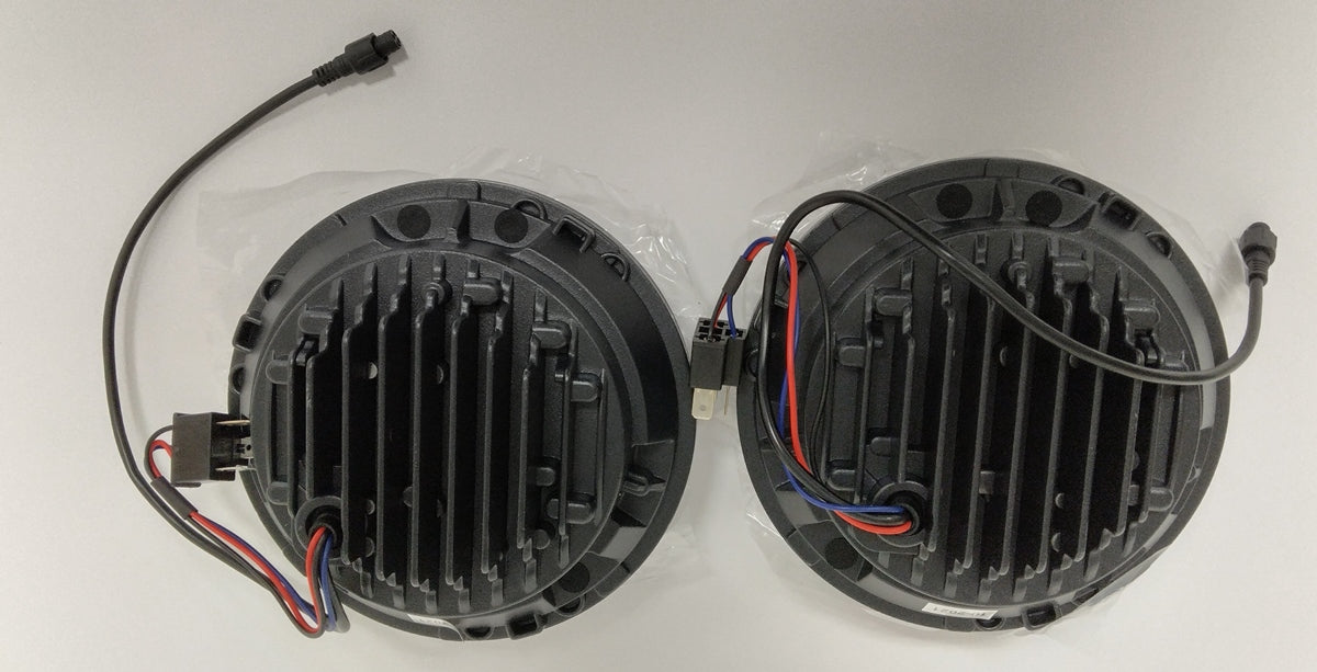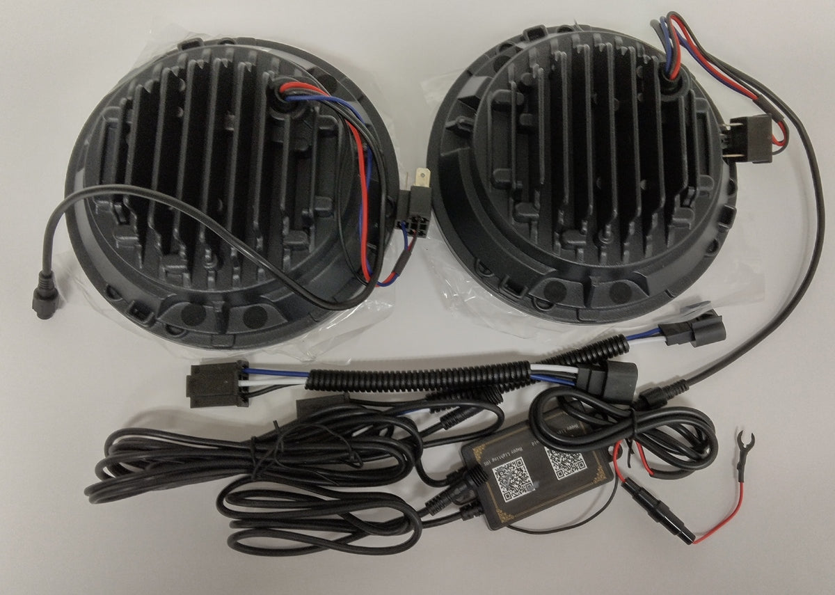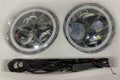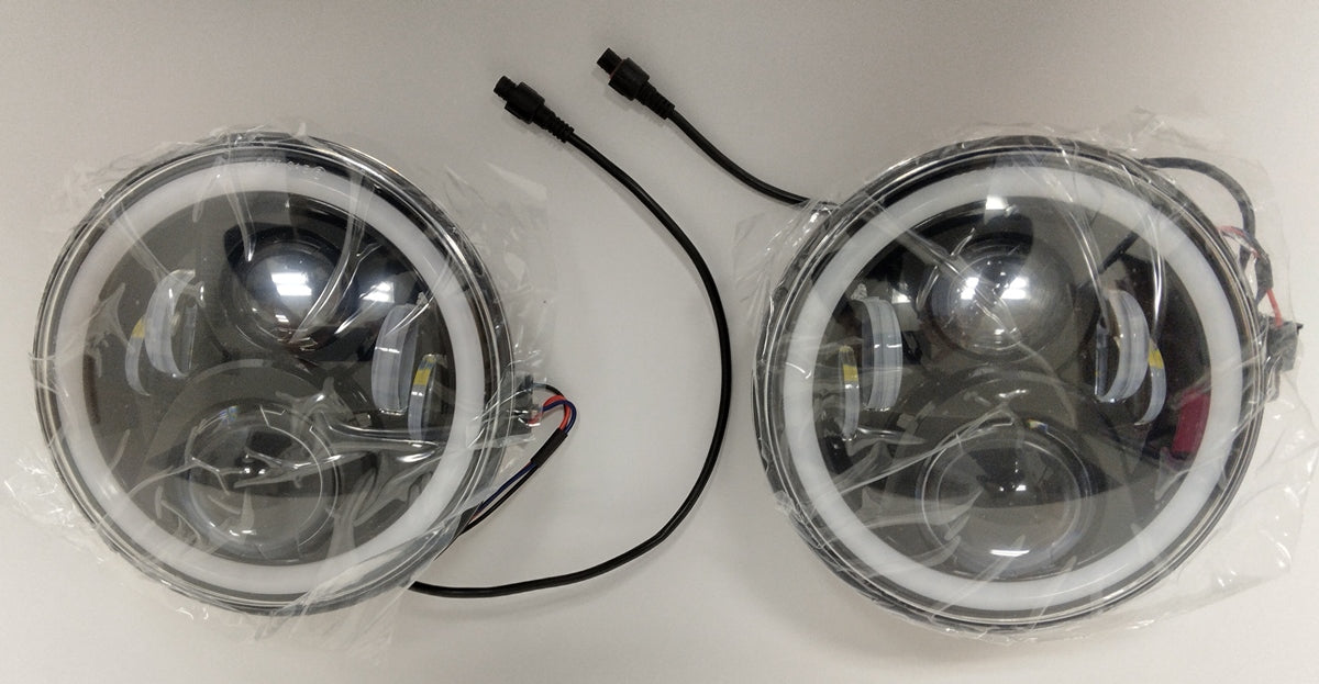 These are 7-inch LED halo projector headlights, designed as an upgrade for vehicles like the Jeep Wrangler and Suzuki Samurai.