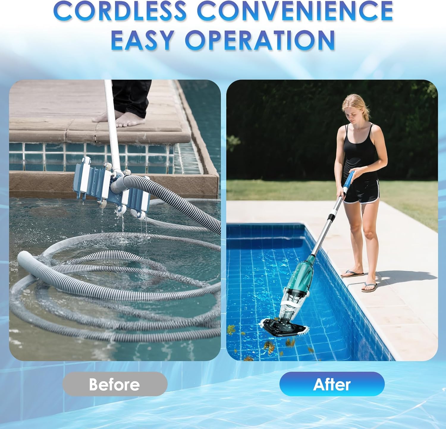 - EASY TO OPERATE - Tool-less installation, connect with the appropriate telescopic pole, activate the switch, the spout is submerged in the water, then you can clean up the water debris; Say goodbye to the annoying hose, cordless design. Comes with a fishing net that fits the telescopic pole to clean up larger debris, such as branches, leaves, or green algae, quickly and efficiently. Reusable filter cup for quick cleanup.
