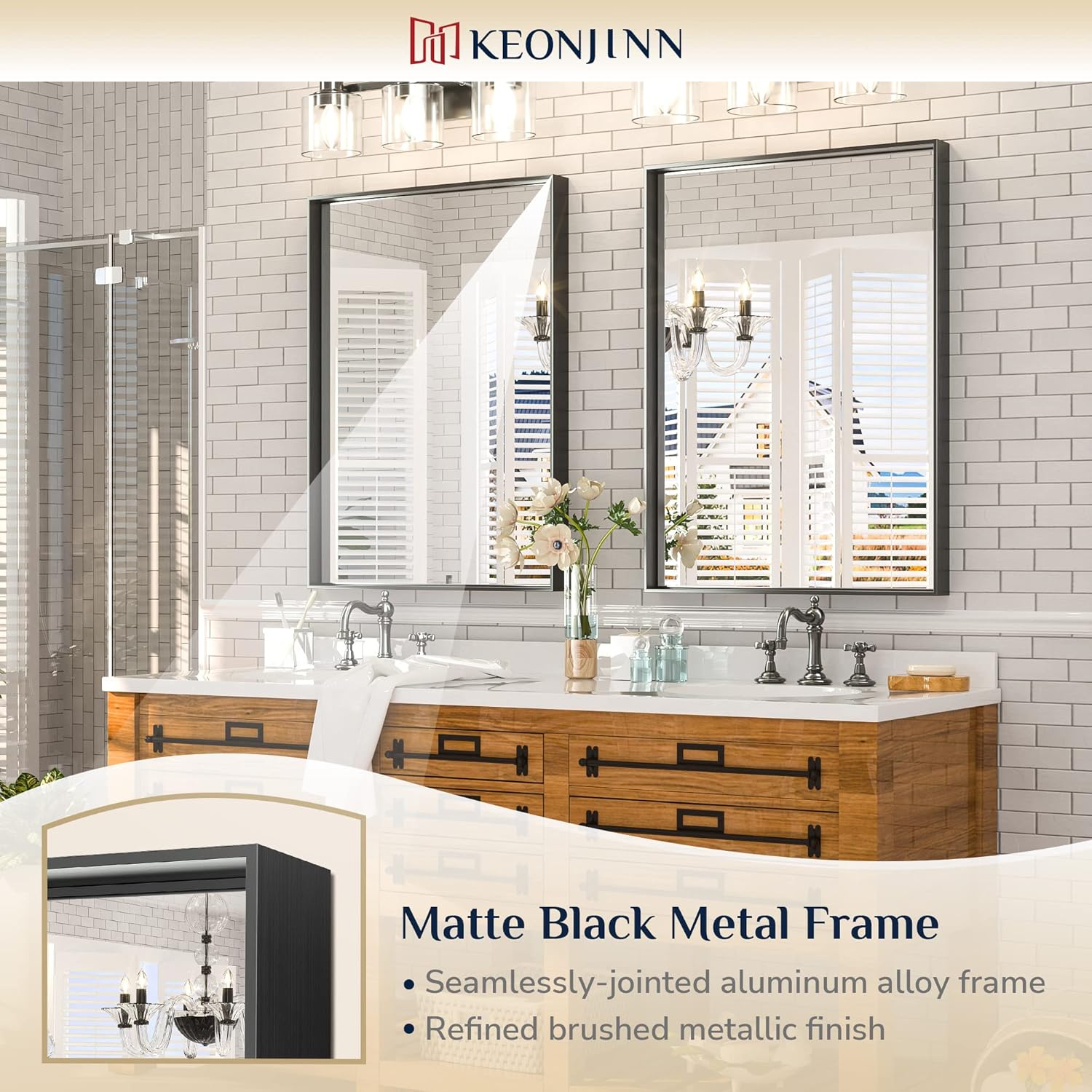 The rectangular wall mirror has the most chic brushed matte black finish, coming with a 1.57" depth Aluminum alloy frame. Square corner mirror features the minimalist style and able to add texture to your space. Give an instant premium upgrade to any room with Keonjinn black metal framed mirror. 【Secure & Easy Installation】The sturdy wall mirror designed with 4 built-in slots on the back for hanging horizontally or vertically. Super easy to install with French cleat brackets. Hardware Included. We have designed a sturdy 4-layer packaging for mirrors, so you don't have to worry about receiving a broken mirror. 【Exceptional Quality】Our black rectangle bathroom mirror is made of HD 5mm glass, bright and anti-distortion, which provides excellent reflection. Aluminum alloy frame and PVC shatterproof film would strengthen the floating glass for safety, waterproof and anti-corrosion in wet bathroom environments.