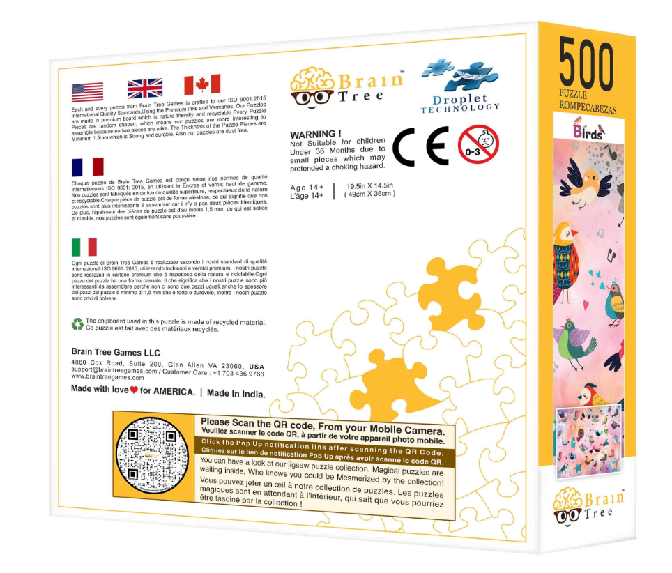 500 Piece Jigsaw Puzzle with a perfect blend of elegance and creativity Each & every piece is unique in shape ( Random Cut ) to make the jigsaw puzzle-solving experience memorable Each puzzle piece is around 1.75 mm thick which makes the puzzles durable and sturdy Every single box of brain tree games 500 pieces jigsaw puzzle contain puzzle poster. High-quality boards are used to give the puzzle a premium look and feel Droplet Technology is used in all our puzzles to achieve anti-glare surface, premium matte effect, and micro water drop effect.