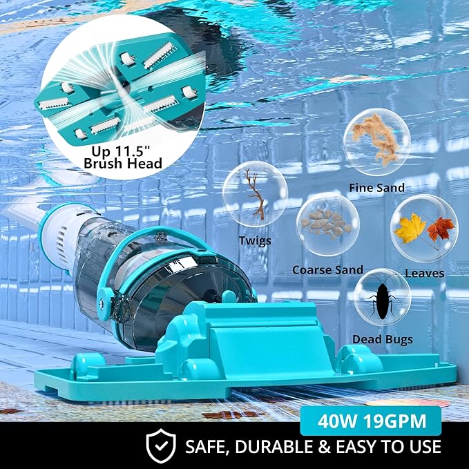 - 【Cordless & Not Heavy】Lightweight cordless pool vacuum gives you total freedom to move around without dealing with tangled cords, with 40W motor with 19.5 gallon/min flow rate to efficiently removes dirt, leaves, and debris, leaving your pool sparkling clean