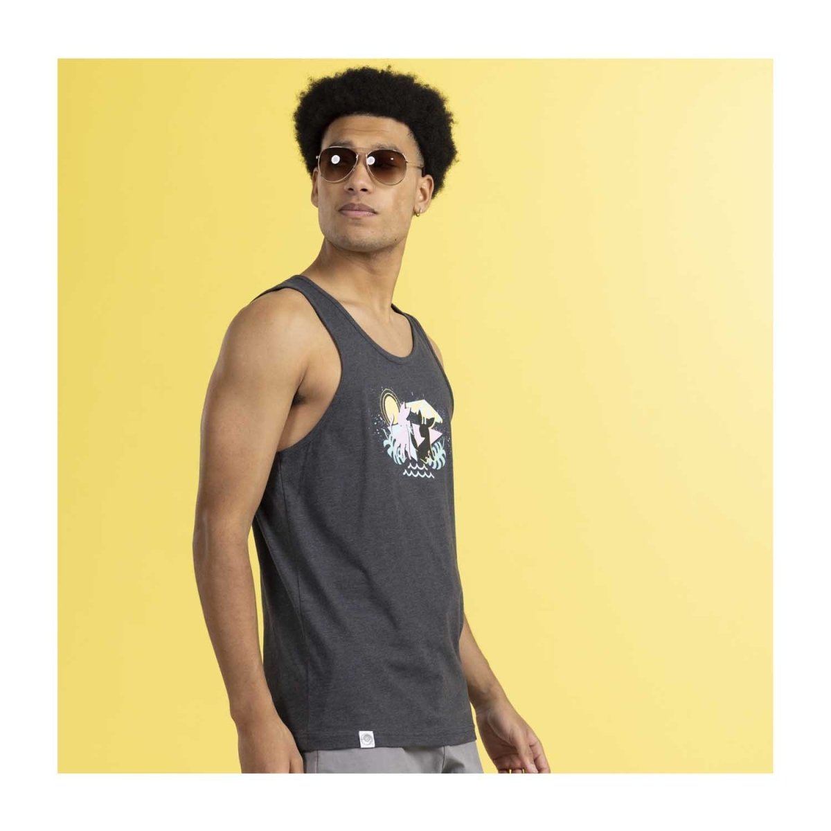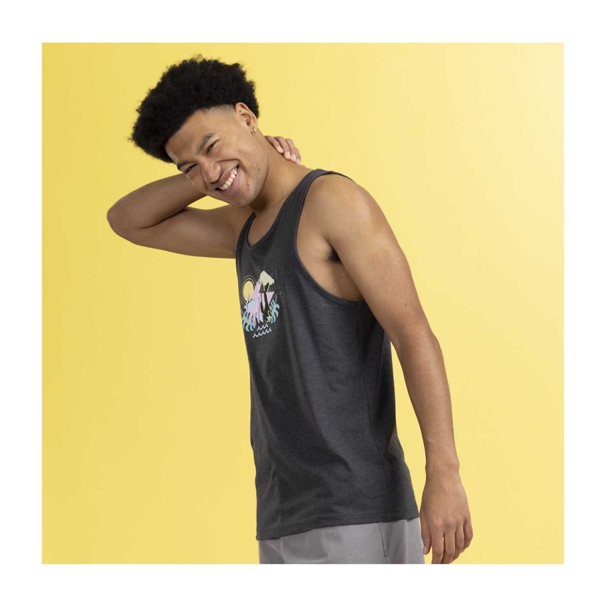With Espeon and Umbreon on your side, you'll have a pal for any time of day! This charcoal gray tank top features silhouettes of the duo on the front in a retro pastel art style, appearing to be next to the sea under the sun. They're ready for a day of poolside fun or a trip to the beach!