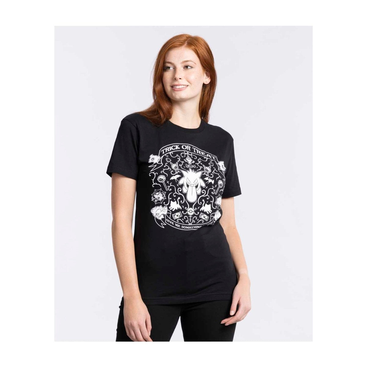 Gengar and a collection of spooky friends pose with treats on this playful white-on-black T-shirt. The graphic is perfect for autumn holidays, and the soft, high-quality cotton fabric ensures that this piece will be haunting your favorite styles for seasons to come!