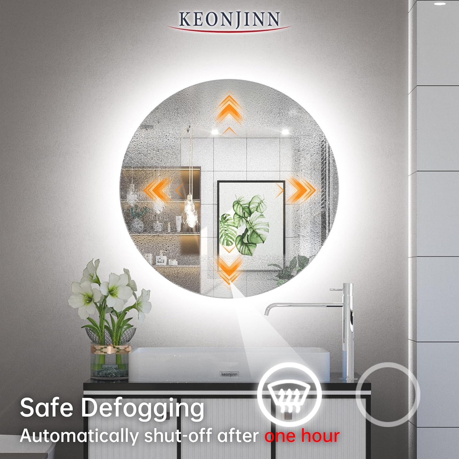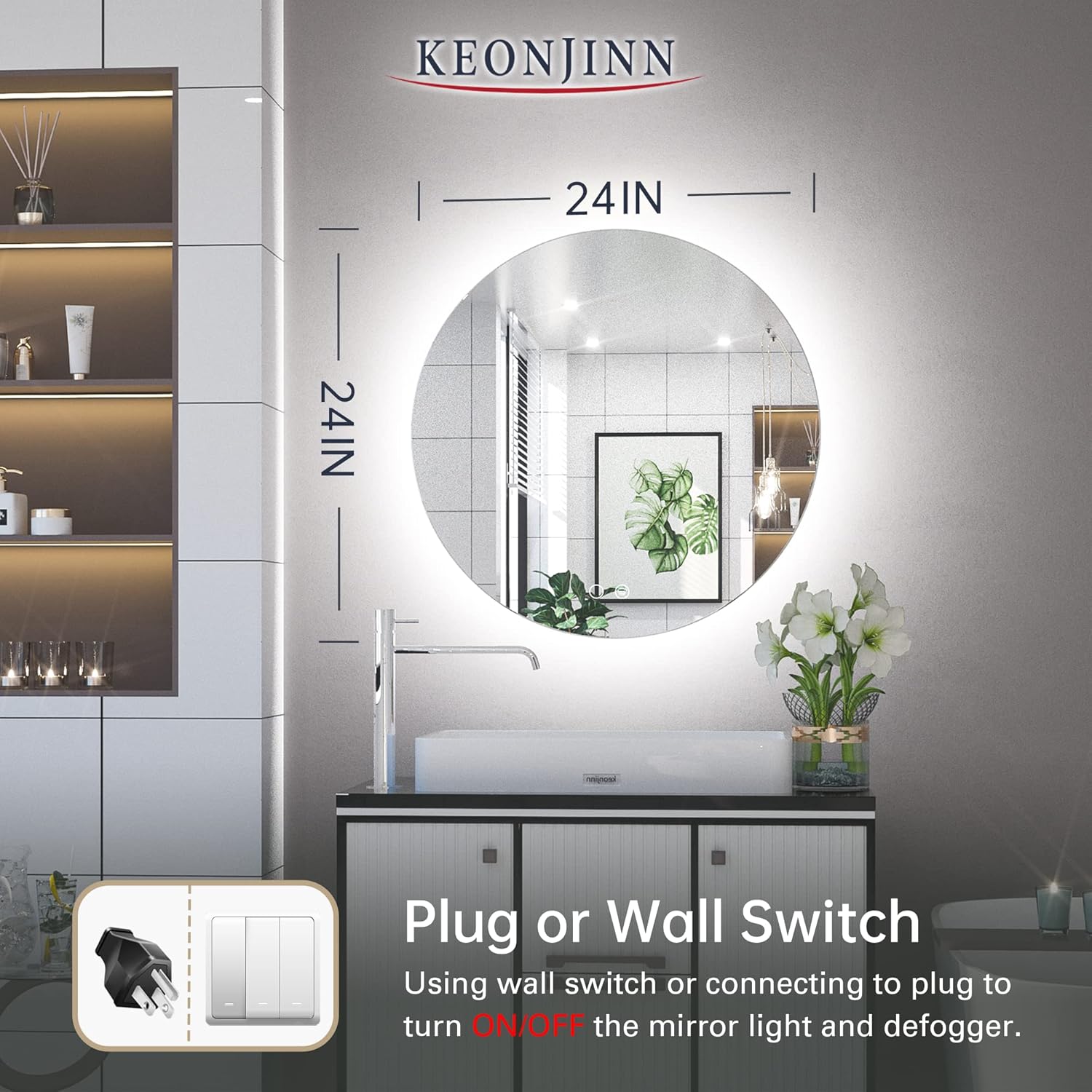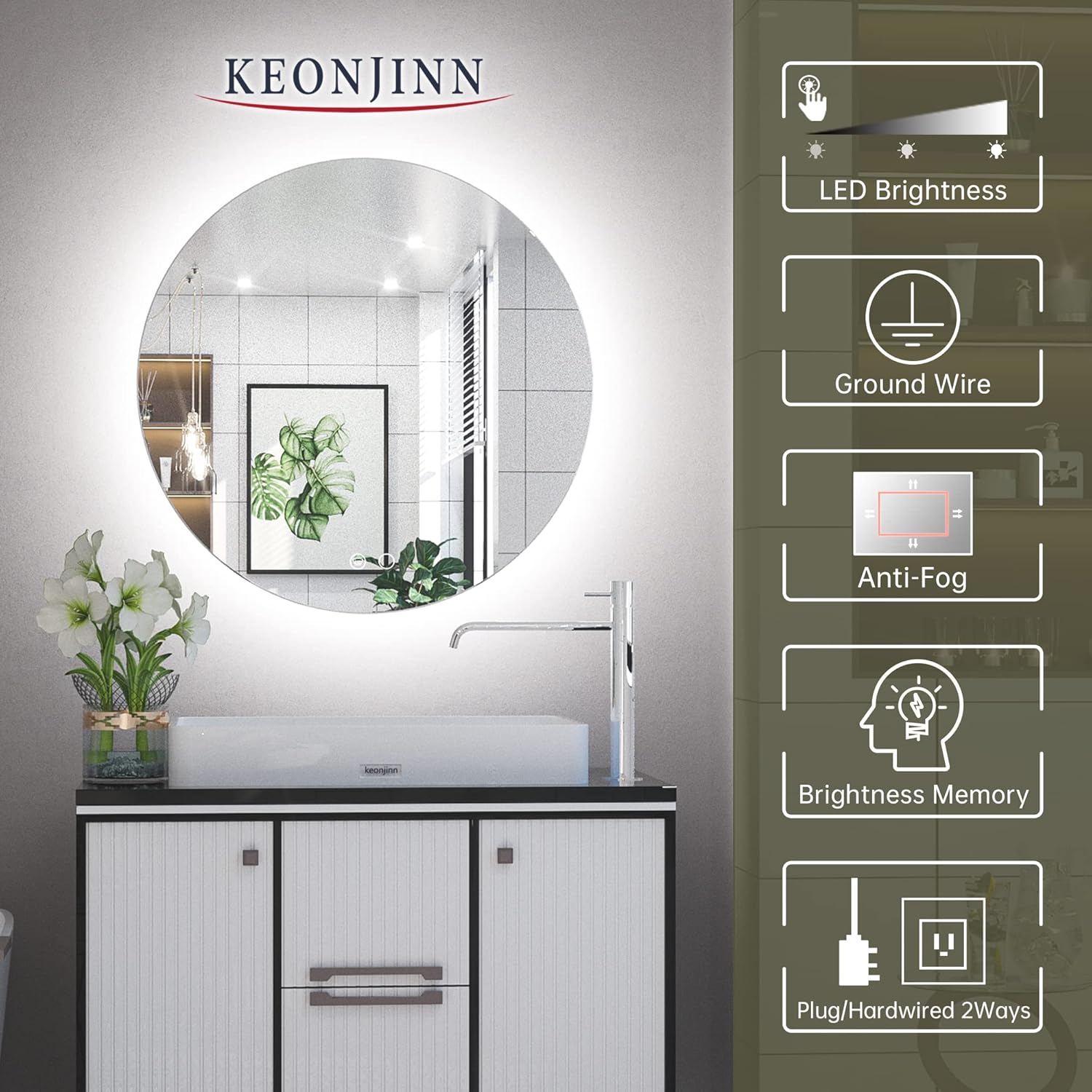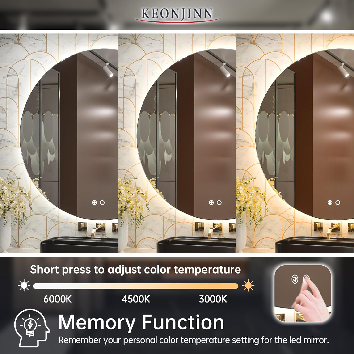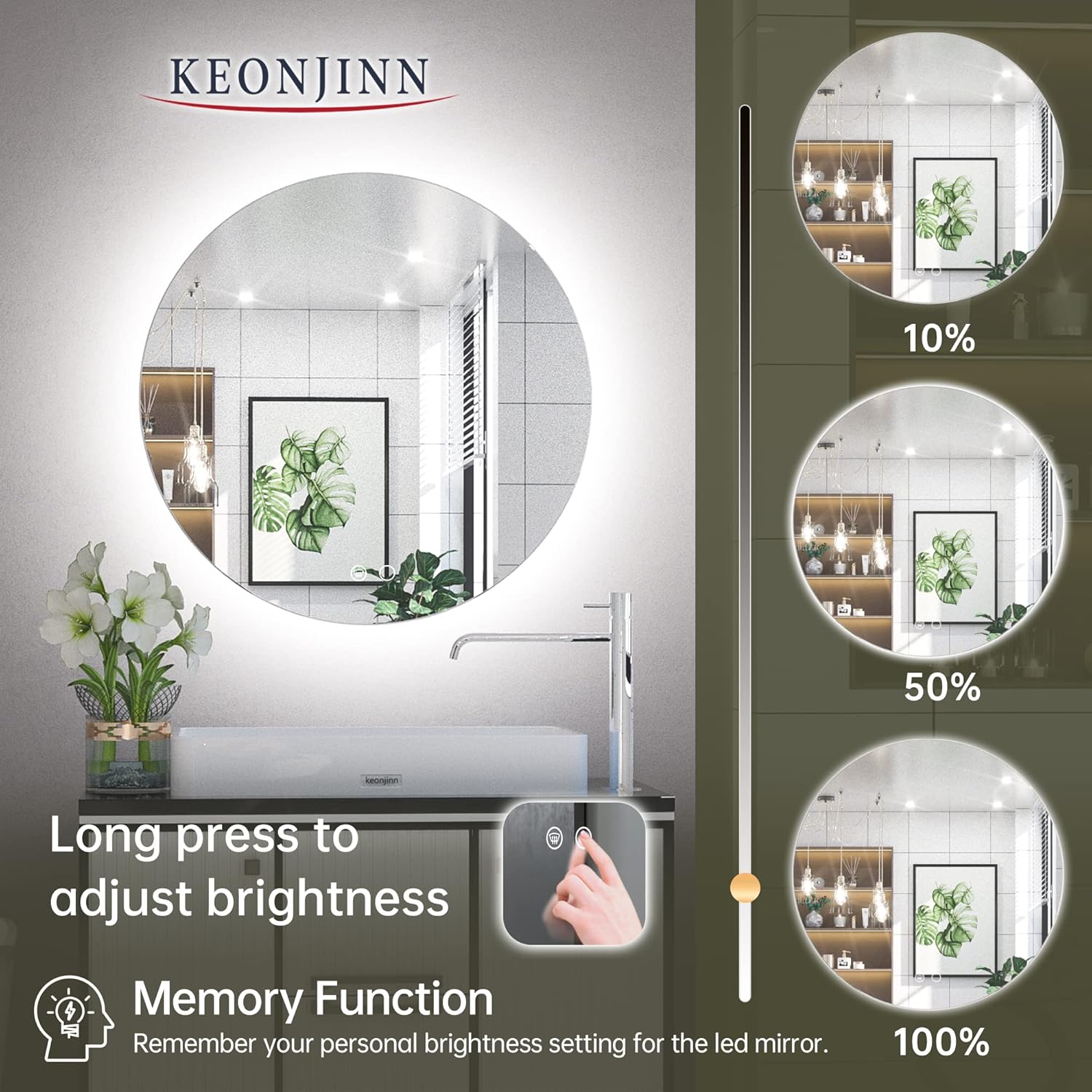 Brand Keonjinn Room type Bathroom Shape Round Product Dimensions 60L x 60W Centimetres Frame material Copper Mounting type Wall Mount Finish type Unfinished Special feature Fogless, Lighted Theme Modern [Dimmable & 3 Color Temperature]: This LED round mirror light is dimmable, controlled with power switch. Simply touch the power switch button for 3 seconds to change light intensity from normal to brightest. Short press to chang the color temperature among white/natural/warm. [Wall Switch Control]: Both buttons have the memory function. The next time the circle mirror is turned on, it will remain the same as the last time it was turned off. It is recommend to use wall switch to control the backlit mirror light and defogger ON/OFF so as to save energy. [Anti-fog Function]: The power switch and anti-fog switch are separate control, anti-fog according to need to open and close, safe and energy-saving. The built-in anti-fog function means no need to constantly treat your mirrors with fog free spray, or rinse them multiple times per shower. UL certified defogging film improves the safety level. [Unique Design]: LED lifetime: 50,000 hours (Using the LED mirror 3 hours a day means it will last 45 Years). With silvered reflection layer, copper free & environmentally friendly. IP44 waterproof rating ensure safe lighting in wet bathroom environments.