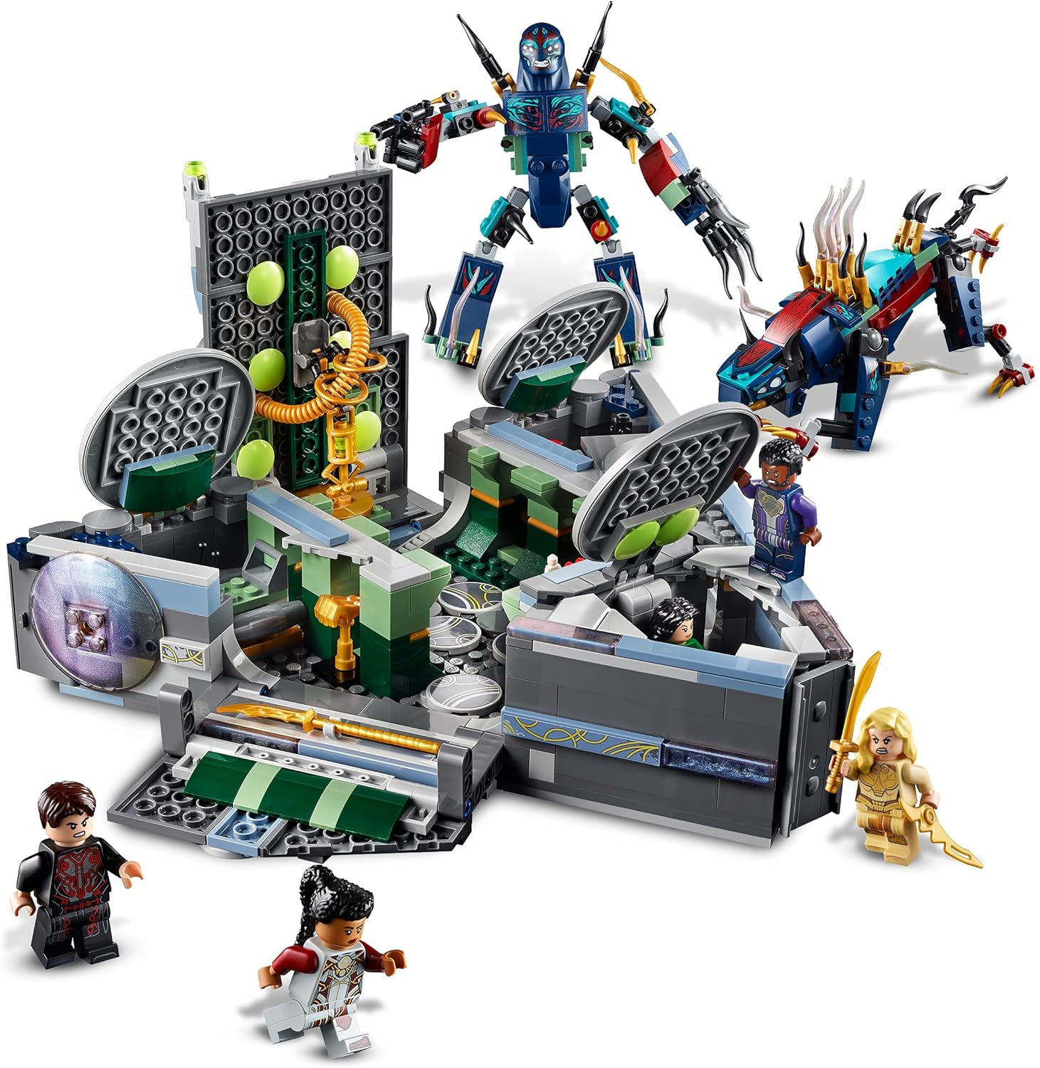 - Includes 6 LEGO Marvel minifigures: Makkari, Ikaris, Thena, Sersi, Druig & Phastos, and 2 Deviant action figures with Kro, the Deviant leader