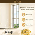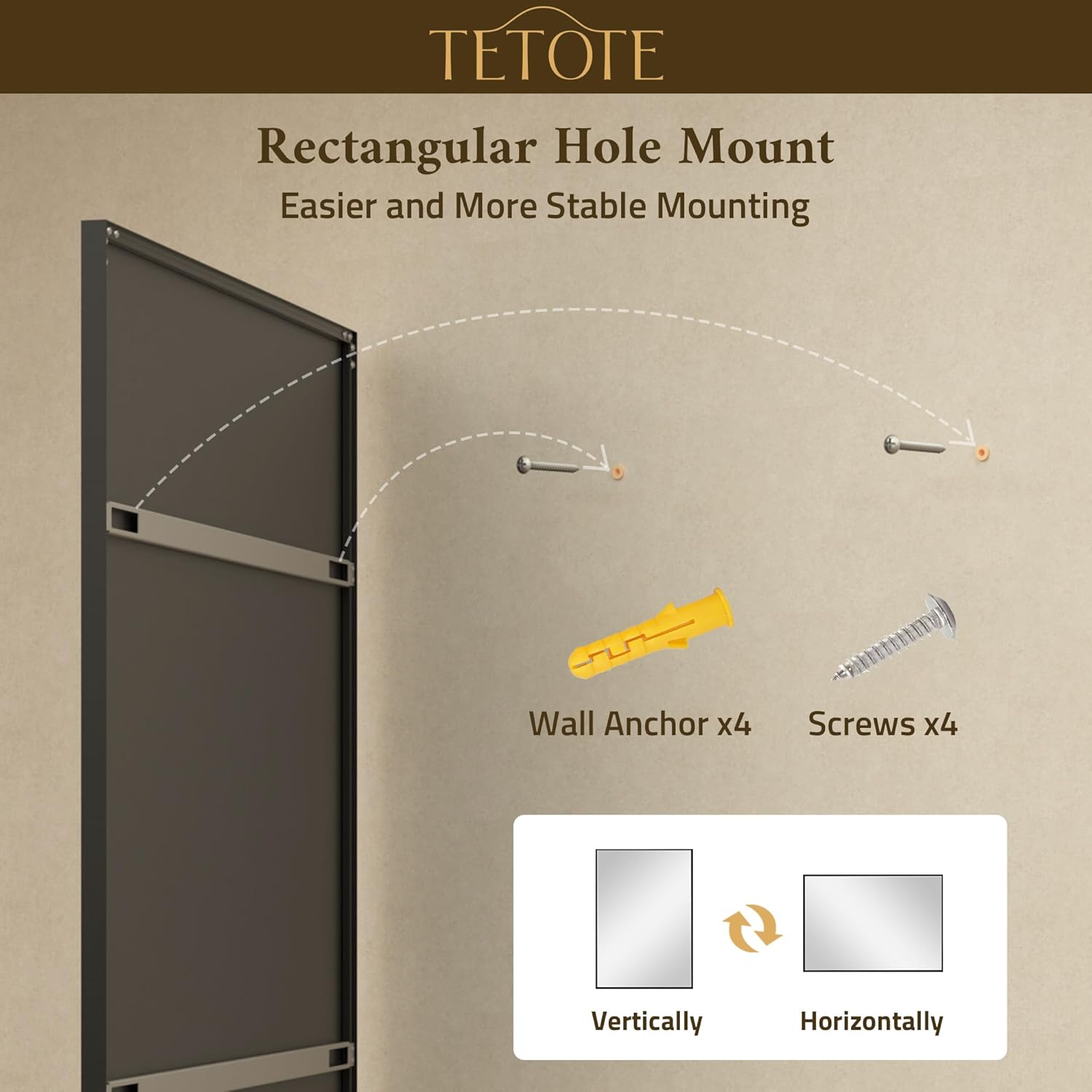 Unique Beveled Edge Design: Our TETOTE black mirror features a beveled edge design that creates dimensional depth and refined elegance. Its classic square-framed rectangular design makes it a stylish choice for living room, bedroom, dressing room, hallway, and entryway. Crystal-Clear Reflection & Tempered Glass: Crafted with premium tempered glass, this black bathroom mirror delivers high strength and impact resistance while providing distortion-free, high-definition reflections.The built-in shatterproof film prevents glass fragment scattering, making it a safe choice for you. Sturdy Mounting Brackets: Our bathroom mirror is designed with metal mounting brackets—eliminating the detachment risks of adhesive brackets, which is more stable and durable. The dual-rivet reinforced corners create can firmly fix the glass on the bracket, ensuring a safe and reliable user experience for you. Premium Aluminum Frame & Brushed Finish: Our black mirror features a premium anodized aluminum alloy frame, offering waterproof, moisture-resistant, and rustproof durability—perfect for humid environments.The frame of black mirror is also processed with a brushed finish to enhance the delicacy and elegance. Easy Installation & Protective Packaging: Our bathroom vanity mirror features rectangular mounting holes for easier installation, offering flexible vertical, horizontal, or lean-against-wall placement to suit your space.