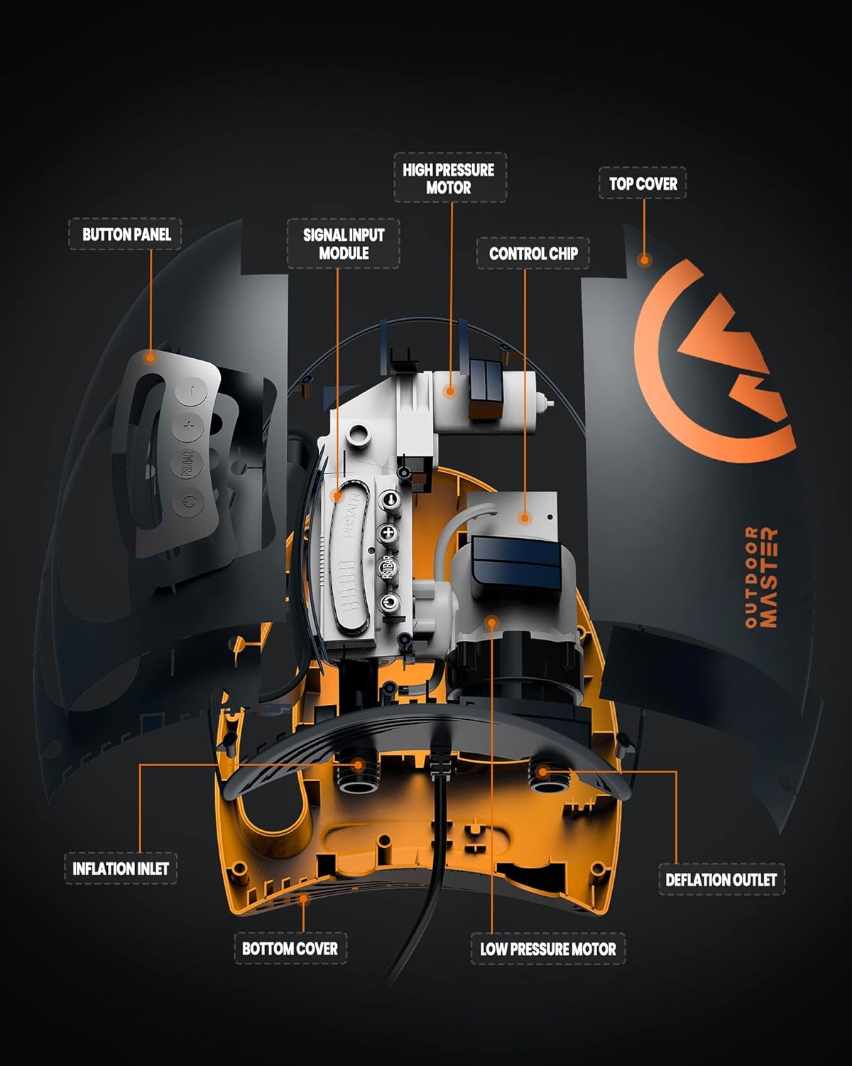 - DUAL STAGE & AUTO OFF FOR EASY INFLATION - Automatic dual stage pump: 1st stage for MAXIMUM SPEED at 350L/min and 2nd stage for MAXIMUM PRESSURE at 70L/min. The AUTO-OFF FUNCTION turns the pump off when target pressure is reached when inflating. When packing up the deflation function will MAKE DEFLATING QUICK & EASY.