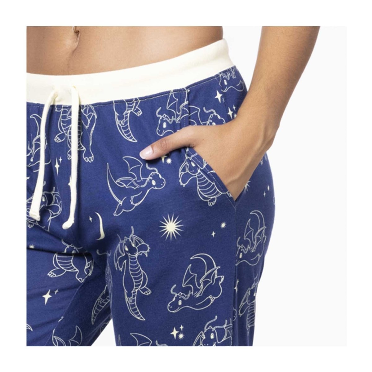 Cozy on up with adorable Dragonite! These navy lounge pants feature the lovable Dragon type outlined in white, showing off various poses next to sparkles and stars on a navy background. As Dragonite patrols the night skies, you'll feel safe knowing this powerful Pokémon is by your side.