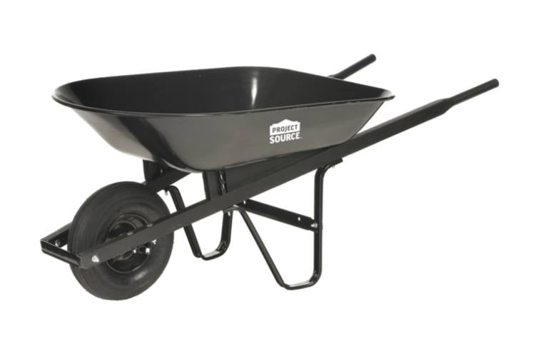 Project Source Wheelbarrow with Steel Tray - 4 cu. ft. - Black Homeowner grade wheelbarrow with seamless steel tray and square hardwood handles. Features 2-ply 14 in pneumatic tire with inner tube, 5/8g's steel axle with nylon bearings. From mulching to general cleanup, it is the perfect size for lots of jobs around the house. It's small enough to be easy to use but big enough to get the job done. Maximum capacity: 160 lbs (72.5 kg). Easy assembly Pneumatic wheel Hardwood handle 4 Cu. ft. steel tray