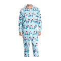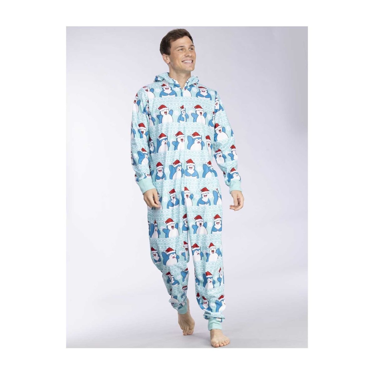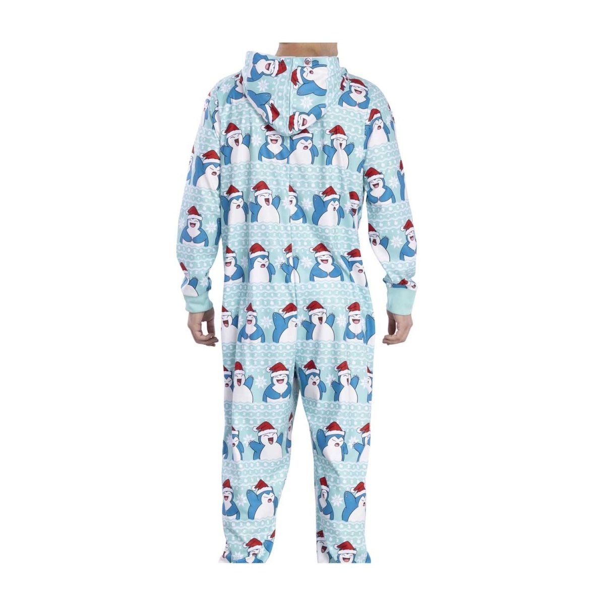 Keep your whole body warm with these one-piece pajamas showing off a very festive Snorlax! The allover print features Santa hat-wearing Snorlax in a variety of different poses surrounded by lots of white snowflakes. Wear this to a holiday pajama party or on those cold winter mornings.
