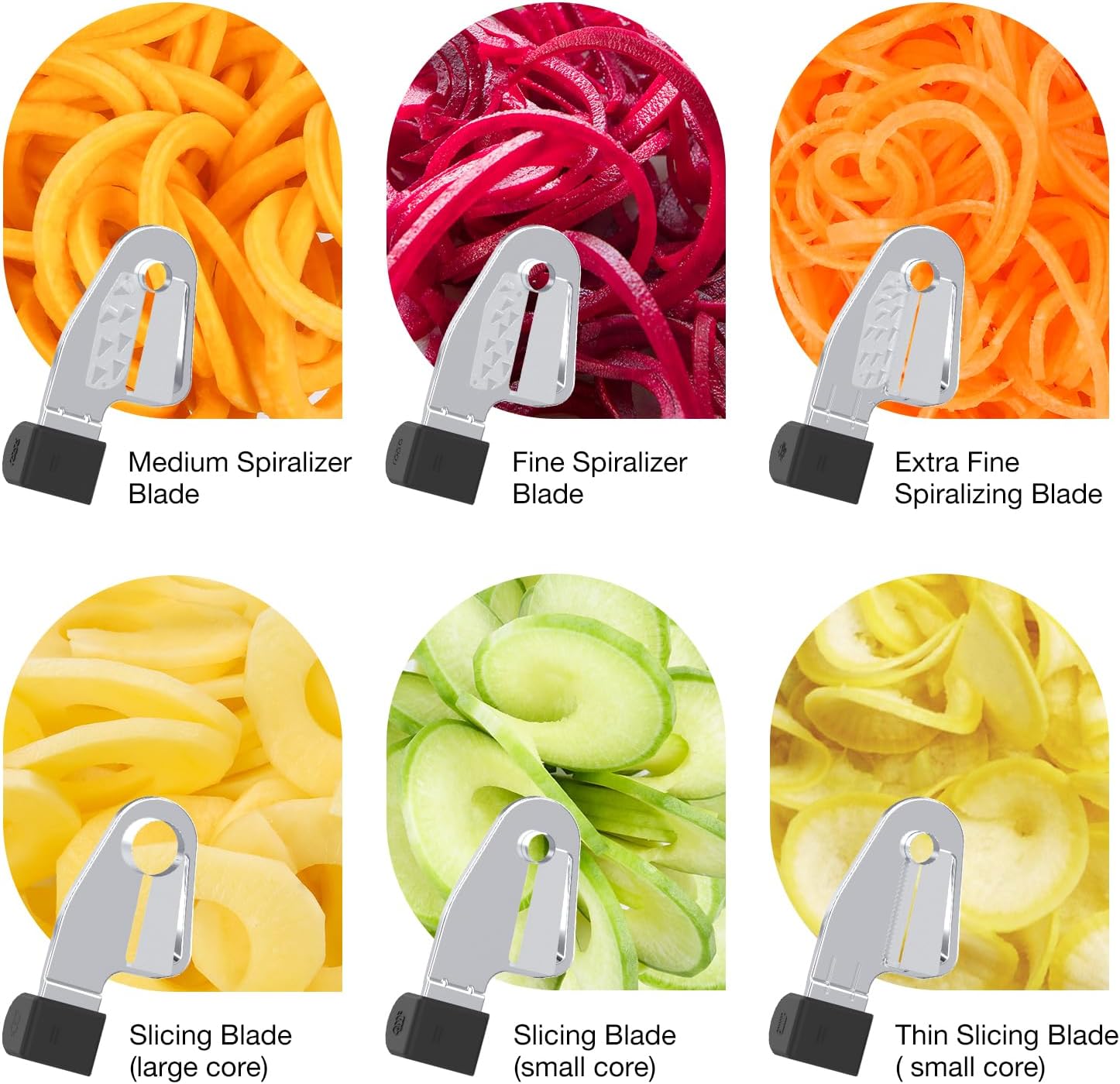 3 Spiralizing Blades - Medium,Fine and Extra Fine; 3 Slicing Blades - Slicing (Large Core), Slicing (Small Core) and Slicing(Thin); 1 Peeling Blade.