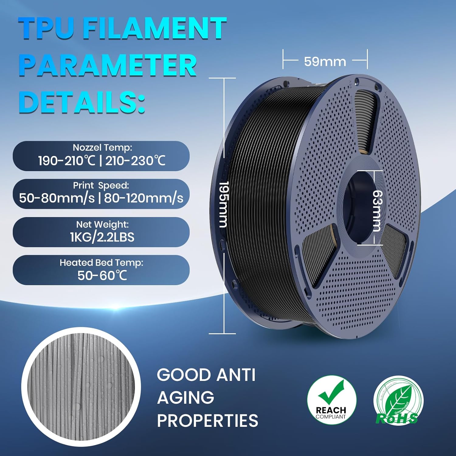 【TPU for Fast Printing】- SUNLU High Speed TPU Filament can print 3 times fast as ordinary TPU filaments, strikes the ideal balance between softness and resilience. Perfect for flexible applications, robotics, and fashion projects. 【TPU 3D Printing Filament】- TPU filament is made of flexible thermoplastic polyurethane, featuring Shore hardness of 95A, and items printed with it can easily withstand severe collisions during sports and wear and tear in daily use. 【Excellent Layer Adhesion】- Setting the standard for impeccable layer adhesion and delivering impressive results. SUNLU TPU features optimal layer bonding and a flawlessly smooth finish 【Excellent Printed Results】- SUNLU TPU filament 1.75mm has excellent layer adhesion, very easy to print. TPU filament is wear-resistant, oil-resistant, good elasticity, anti-aging, color, no bobble. 【TPU Recommend Settings】- We recommend printing at a nozzle temperature of 210-230°C, bed temperature of 50-60°C, printing speed of 80-120mm/s, faster and better. 【TPU 1.75mm Diameter】- Dimensional Accuracy +/- 0.03mm. SUNLU filament has wide compatibility due to the small diameter error, it's suitable for almost all 1.75mm FDM 3D printers. 【Multiple Color Available】- SUNLU TPU filament offers a wide variety of color options, from classic black and white to vibrant bright colors, to meet users' different printing needs and pursuit of individuality and beauty.