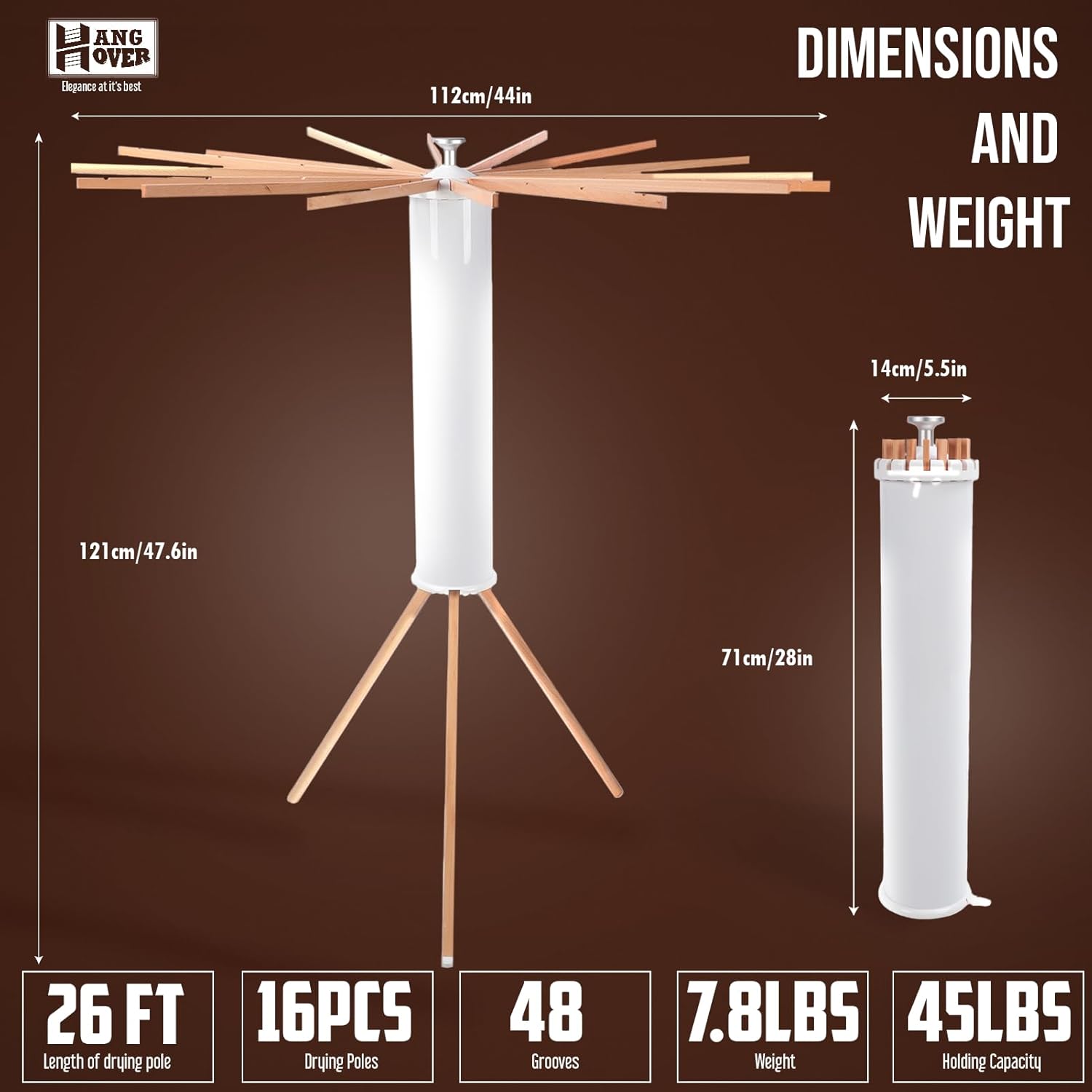 - πͺπ½ STURDY & DURABLE STRUCTURE >>> This umbrella-type laundry dryer rack is easy to move around with a leg spread of 21.6" (55cm) on top of 28" (71 cm) body, and a wingspan of 20" (51 cm) with 16 drying rods. It offers a larger hanging surface to dry larger loads of household laundry compared to conventional drying racks.