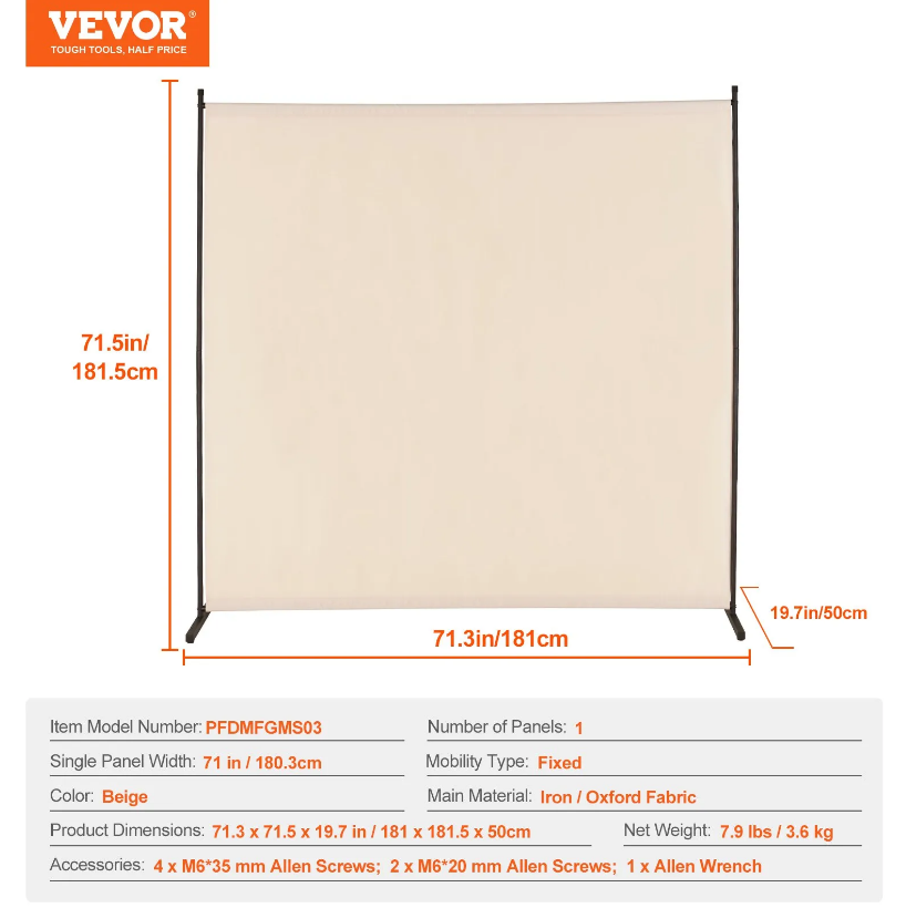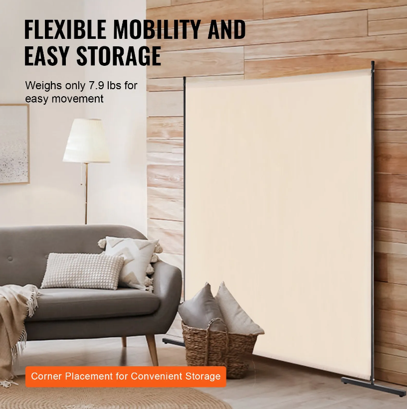 High-Quality Materials: The single panel room divider is designed with upgraded to Oxford fabric, which is sturdy , waterproof and can give you more privacy. The frame is made of iron material, which is reliable and can make sure that the room divider won't fall. And there are 3 color options to match your home decor and create the ideal arrangement to meet your privacy needs. Easy to Move: The privacy screen measures 71.3×71.5×19.7 in / 1810×1815×500 mm and 7.9 lbs. It's lightweight and easy to move to anywhere you want. Widely Occasion: The room divider panel can be used is different rooms, like bedrooms, living rooms, offices, and hospitals to create private partition spaces, which makes it easy to create a private space in your home, enhance the privacy of an open office, or create a unique area in a hospital or restaurant. Easy Assembly & Storage:With all the necessary parts and clear instructions included, assembly is straightforward and takes about 15 minutes—two people are recommended for the process. When not in use, simply fold it up and store it away in a corner, saving space. Note: Due to long shipping times, the fabric may have slight wrinkles, so steaming before assembly is recommended. Durable Frame Design: To ensure stability and longevity, the frame is made of strong iron, resistant to rust and wear. The widened and lengthened base provides a better floor fit, while the anti-slip feet make the structure more stable, preventing wobbling or tipping over.