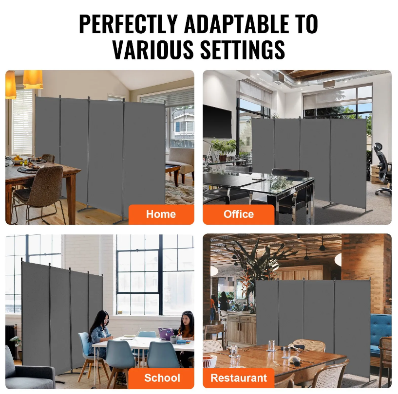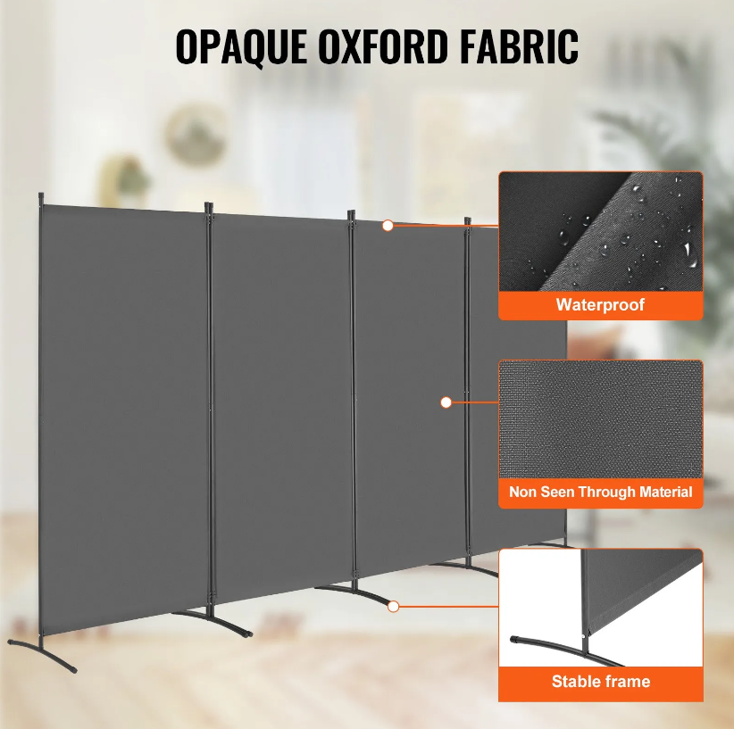 High-Quality Materials: This 4 panel room divider is designed with upgraded to Oxford fabric, which is sturdy , waterproof and can give you more privacy. The frame is made of iron material, which is reliable and can make sure that the room divider won't fall. And there are 3 color options to match your home decor and create the ideal arrangement to meet your privacy needs. Widely Occasion: The room divider panel can be used is different rooms, like bedrooms, living rooms, offices, and hospitals to create private partition spaces, which makes it easy to create a private space in your home, enhance the privacy of an open office, or create a unique area in a hospital or restaurant. Easy to Store: The privacy screen measures (136.4 x 72.4 x 20.4 in / 3464 x 1840 x 520 mm), each panel measures 34 W x 72.4 H inch. It's foldable, you can easily move to anywhere you want. Easy Assembly & Storage: With all necessary accessories and clear assembly instructions, the room screen is easy to set up in about 15 minutes—two people are recommended for the process. For stability during use, we suggest slightly folding the W-shaped sections. When not in use, simply fold it and store it in a corner, saving space. Versatile Usage: This room divider screen is perfect for bedrooms, living rooms, closets, kitchens, offices, and more. It can create a private space at home, enhance privacy in open offices, or establish unique zones in places like hospitals or restaurants.